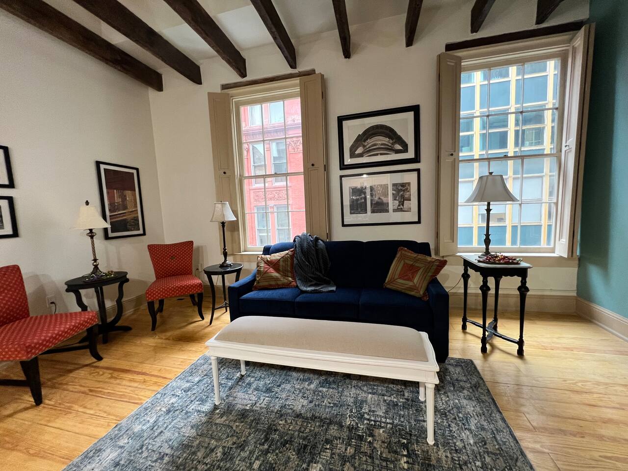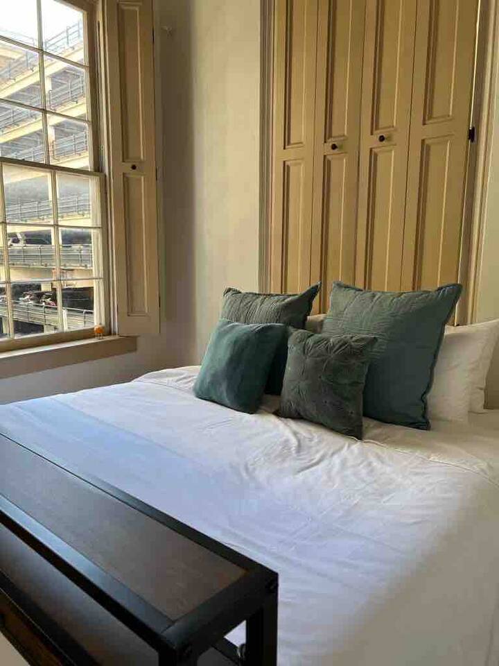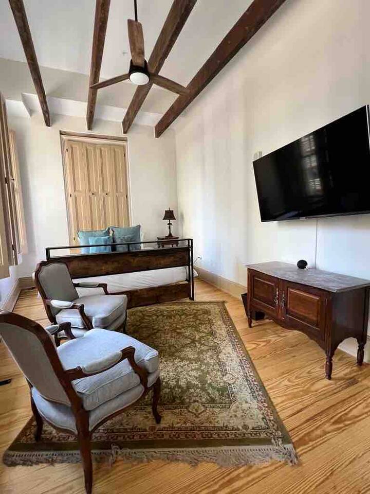 The Space: Experience the charm of our newly renovated property in a historic building originally built in the 1840s. This listing includes three separate units taking up the top two floors of our building in the heart of New Orleans - Bourbon (sleeps 6), Jazz (sleeps 6) and Carnival (sleeps 4). On request, we can also include our luxury owners suite (sleeps 2). If this space is too large, each individual unit can also be rented separately for a small group. Included in this rental is the amazing Carnival unit with a 750 sq ft open floor plan with attached 1100 sq ft deck with views of most of the parade routes. Situated one block from the famed French Quarter, our property, Camp & Commons, is strategically located just blocks away from the renowned Bourbon Street, the Aquarium, Royal St, and other key attractions. Or jump on the street car, also one block away, to enjoy the Garden District, City Park, Audubon Zoo and more. Whether you're keen on exploring the vibrant city of New Orleans or celebrating a special event with family and friends, Camp & Commons offers the ideal setting in the heart of the Big Easy. BEDROOMS: This property sleeps 16+ guests. See bed count below: - King beds - 4 - Queen beds - 1 - Queen sofa sleepers - 3 Kitchen and Dining: Our kitchen is fully equipped with modern appliances, cookware, and a stylish dining area for enjoying meals together. Whether you prefer cooking a gourmet dinner or ordering from local eateries, you'll find everything you need to make your dining experience enjoyable. Parking: There is a paid parking lot across the street and a lot of pay-parking in the area. Key Features: Large entertainment space with Smart TV Self Check-In Pet-Friendly A roof deck that can be rented separately for events (contact us for more information) Amenities: High-speed Wi-Fi Towels and linens provided Complimentary toiletries Property Highlights: Party-Friendly: Our spaces are ideal for various types of gatherings, including wedding receptions, bachelor/bachelorette parties, graduations, and more. We guarantee privacy, comfort, and ample space for you to revel in style. Ride in Style: Allow us to handle all the logistics! Inquire about our transportation options to safely and conveniently navigate your group around town. Fun and Frolic: Count on us to assist in creating a fantastic schedule packed with thrilling activities and entertainment choices, ensuring the party keeps going strong. Delicious Delivered: Indulge in the convenience of having an in-building restaurant Fleur-de-lis, open for breakfast and lunch. You may also book our private chef for an elevated dining experience for intimate celebrations. Contact us for more details. Elevate the Festivities: Amp up your celebration with our food and beverage packages, complete with drinks, snacks, and more. Get in touch with us, and we'll take care of the delivery and cleanup details.